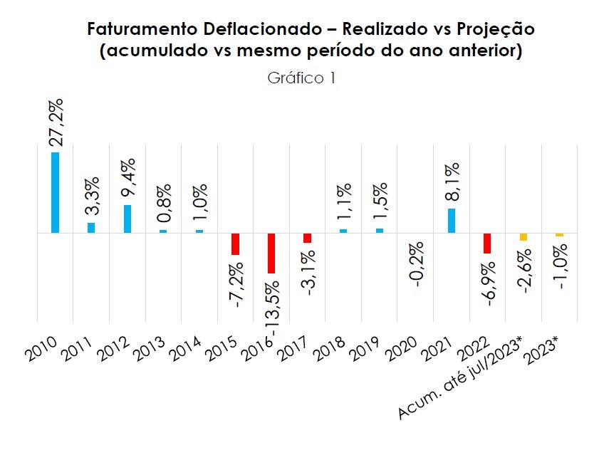 A nova edição da pesquisa ainda aponta os dados consolidados de junho de 2023. No período, a indústria de materiais de construção teve faturamento 2,3% menor que o observado em junho de 2022. Os materiais básicos tiveram aumento de 1,7% e os materiais de acabamento queda de 8,5% na base de comparação interanual.